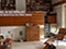 Funktionstrakt. Im Inneren gehen die Räume fließend ineinander über, teilweise sind sie durch große Schiebetüren trennbar. Zwischen Essraum und Küche ersetzen Schrankelemente die Wände. Die Konstruktion ist schlicht, das Mauerwerk vielfach sichtbar. Dazu wird Holz kombiniert, wie etwa auf der Empore im Wohnraum. Mit Designklassikern und modernen Möbeln lässt sich eine Brücke in die heutige Zeit bauen.